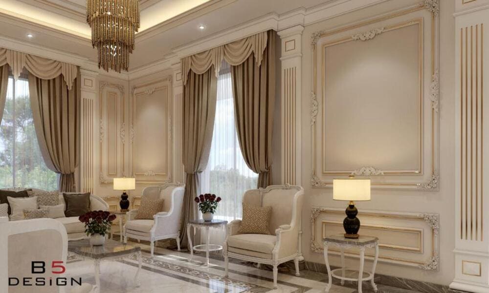By designing and implementing residential villa decorations in 2022, the B5 Design team took into account all the minute details Paying attention to high ceilings and their height, walls and their layout, windows, coordinating curtains, distributing furniture with high consistency across free and interconnected spaces, and allocating rooms to receive guests. Furnishing bedrooms and bathrooms and coordinating living rooms and dining rooms decorated with chandeliers. The accessories are coordinated to blend with the distinct design of the villa to provide a comfortable and warm atmosphere.
